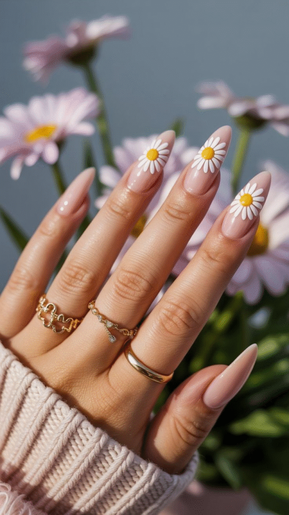 Add a touch of whimsy and cheer to your manicure with delicate daisy patterns on a clear or pastel base. You can paint a single daisy on your ring finger as an accent or cover every nail for a playful, bohemian vibe. This look is perfect for spring or summer and is sure to bring a smile to your face.