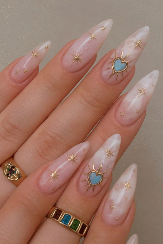 Sometimes the smallest details make the biggest impact. For a cute and subtle look, try adding tiny, delicate heart or star decals on a neutral or nude background. It’s a sweet and simple way to add a bit of personality to your nails without a lot of effort.